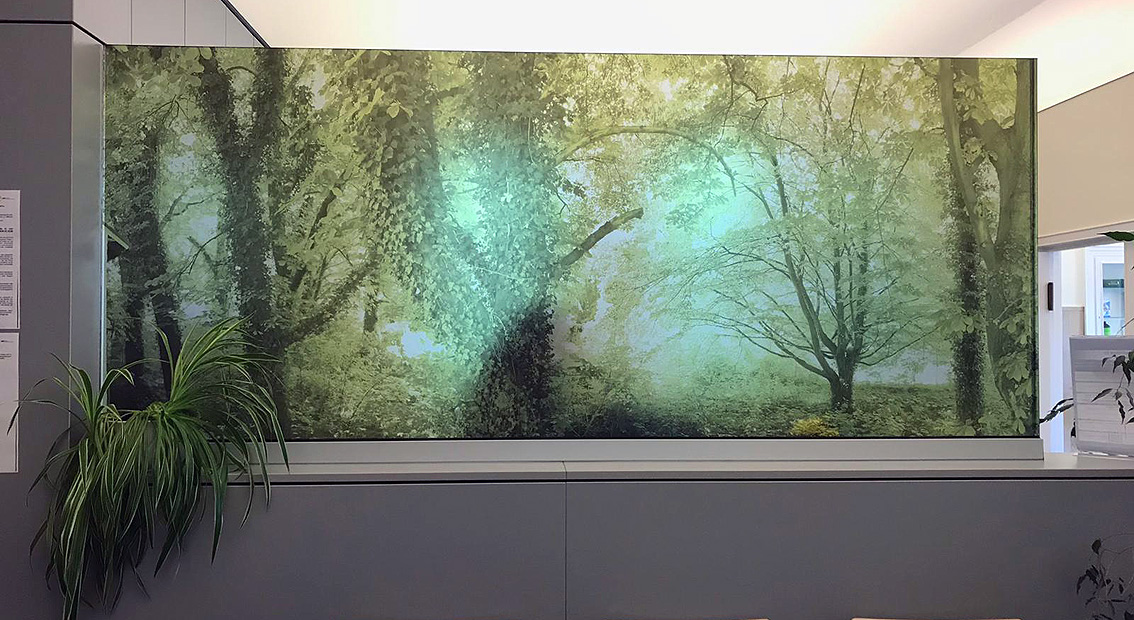 Beschichtung von Spritz-und Sichtschutz mittels bedruckter Glasdekorfolie